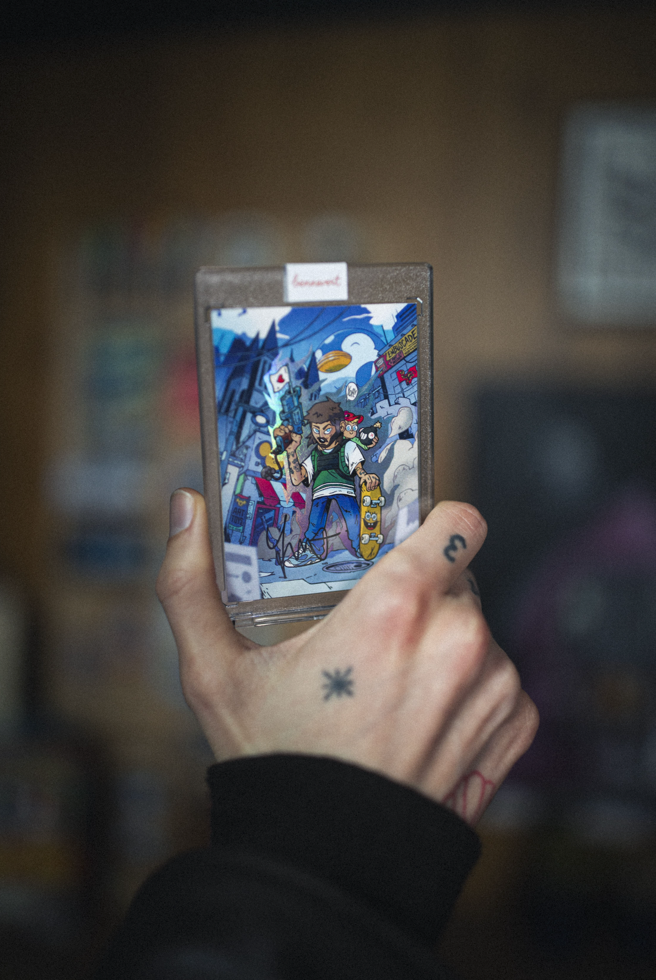 Elle représente Ben et son fils dans une illustration originale signée Massy Puster. L’image est remplie de références à Caen, au tatouage et à des contenus vidéo de Ben.
